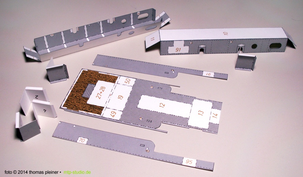 • ein für einen Modellbogen gänzlich ungeignetes Kartonmaterial (beidseitig gestrichen), die Folge sind extrem „bröselnde“ Schnitt- und Knickkanten.