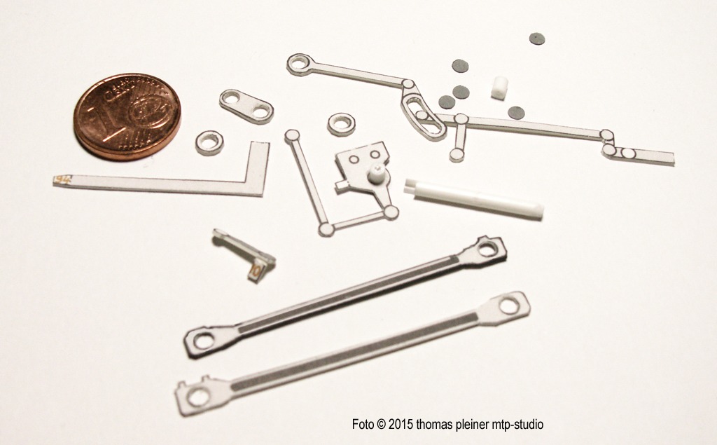 Das Modell ist für eine bewegliche Ausführung der Treib-, Kuppel- und Steuerstangen ausgelegt. Nach eingehener Betrachtung der dazu im Bogen vorgesehenen Teile habe ich jedoch darauf verzichtet und mich auf ein Standmodell beschränkt. Der in einem der untenstehenden Fotos gezeigte vollständige Antrieb lässt das FEHLEN einiger entscheidendender »Gelenke« erkennen. Die prinzipiell mögliche Beweglichkeit wäre nach 2—3 Radumdrehungen bereits wieder zu Ende. Die Nachbildungen der Schiebersteuerung(en) würden etwaigen Bewegungen nur kurz standhalten …