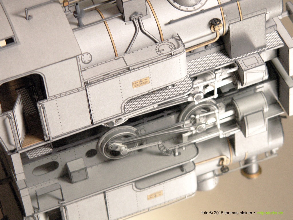 Das Modell ist für eine bewegliche Ausführung der Treib-, Kuppel- und Steuerstangen ausgelegt. Nach eingehener Betrachtung der dazu im Bogen vorgesehenen Teile habe ich jedoch darauf verzichtet und mich auf ein Standmodell beschränkt. Der in einem der untenstehenden Fotos gezeigte vollständige Antrieb lässt das FEHLEN einiger entscheidendender »Gelenke« erkennen. Die prinzipiell mögliche Beweglichkeit wäre nach 2—3 Radumdrehungen bereits wieder zu Ende. Die Nachbildungen der Schiebersteuerung(en) würden etwaigen Bewegungen nur kurz standhalten …