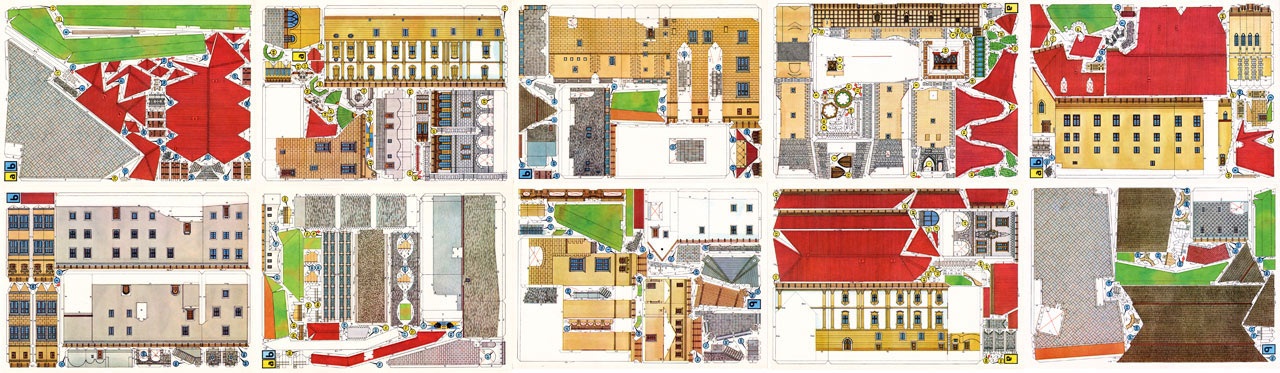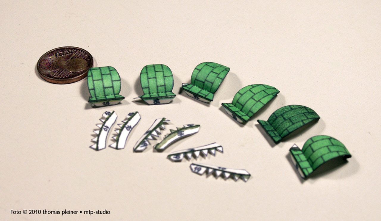 Das Kartonmodell ist mit 10 Bogen im Format 24 x 33 cm recht umfangreich und zeigt die für Richard Vyskovsky übliche »dichte« Packung. … alle 10 Bogen (spasseshalber) mal nebeneinander: Zur Vorbeugung extrem niedrig aufgelöst. … aber eins nach dem anderen.