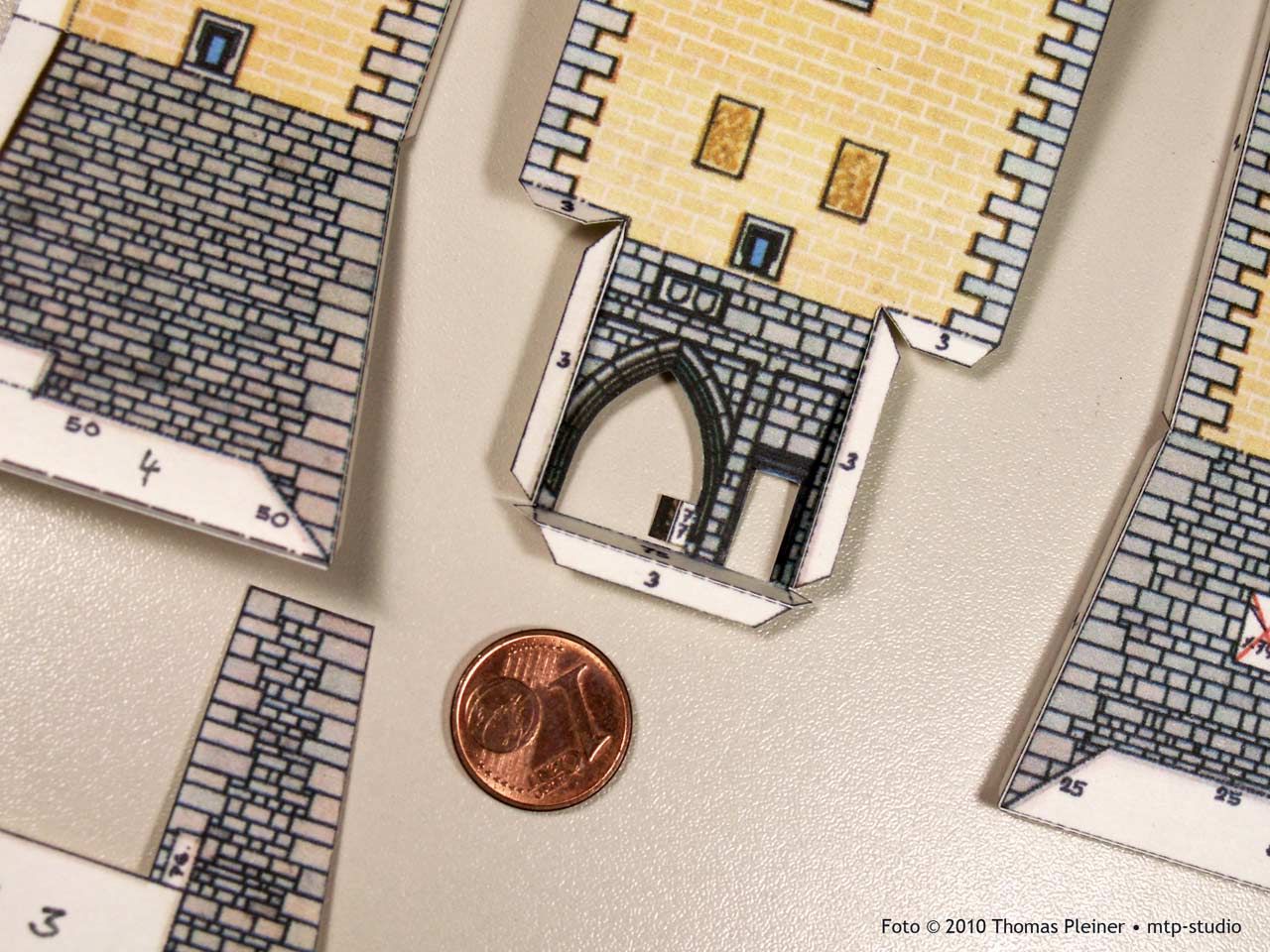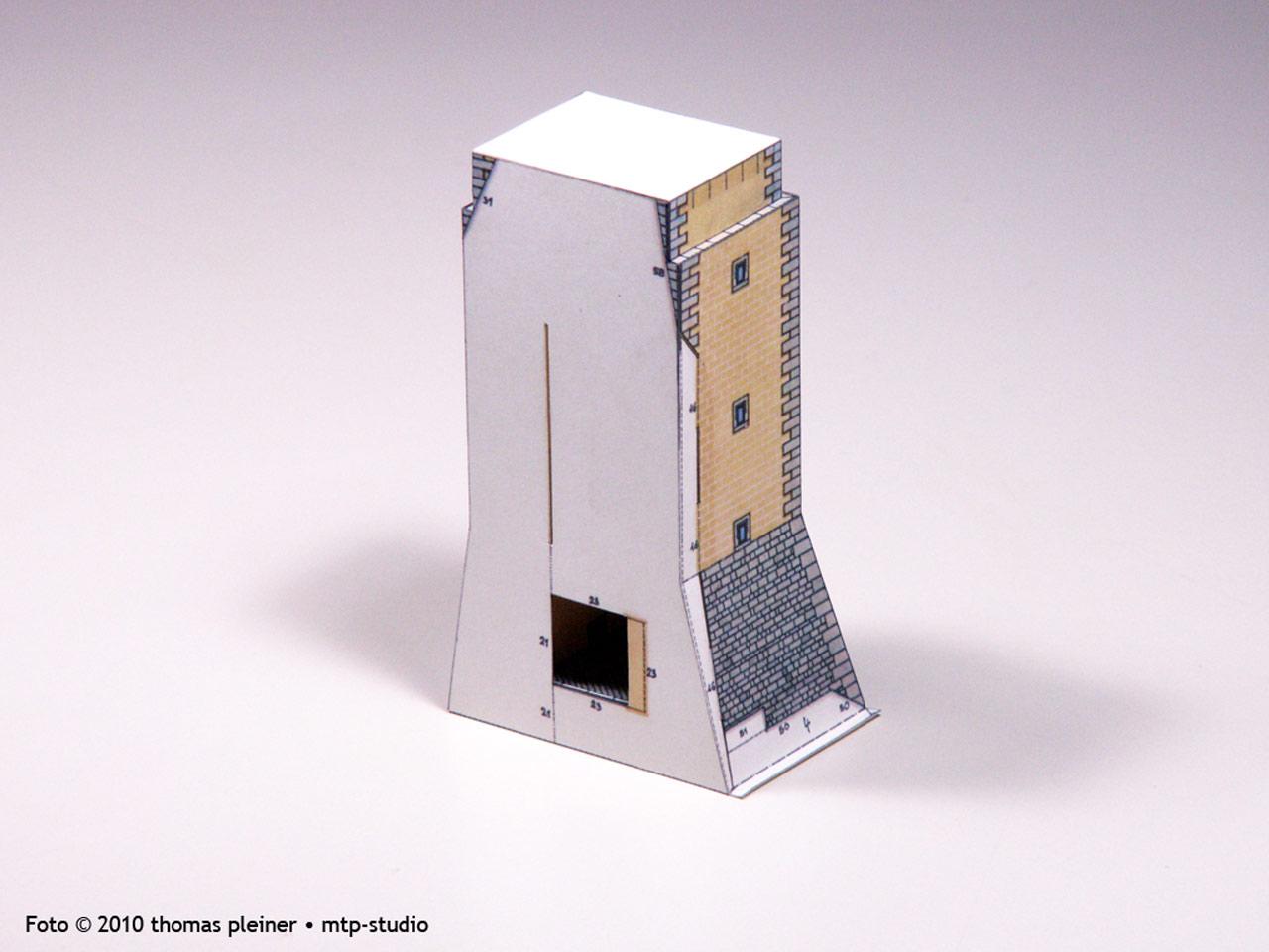 Die Darstellung des Natur-Bruchsteinmauerwerks ist hier künstlerisch absolut akzeptabel gelöst und wirkt im Rahmen des grafischen Gesamtkonzeptes angenehm. Dennoch wird ausnahmsweise die mit etwas unruhigem Pinsel dargestellte Steínstruktur dem „natürlichen“ Vorbild nicht 100%ig gerecht – das ist auch selbstverständlich keine Wertung sondern schlicht eine Beobachtung. Ähnliches ist auch bei anderen Burgmodellen derselben Schaffensphase festzustellen.