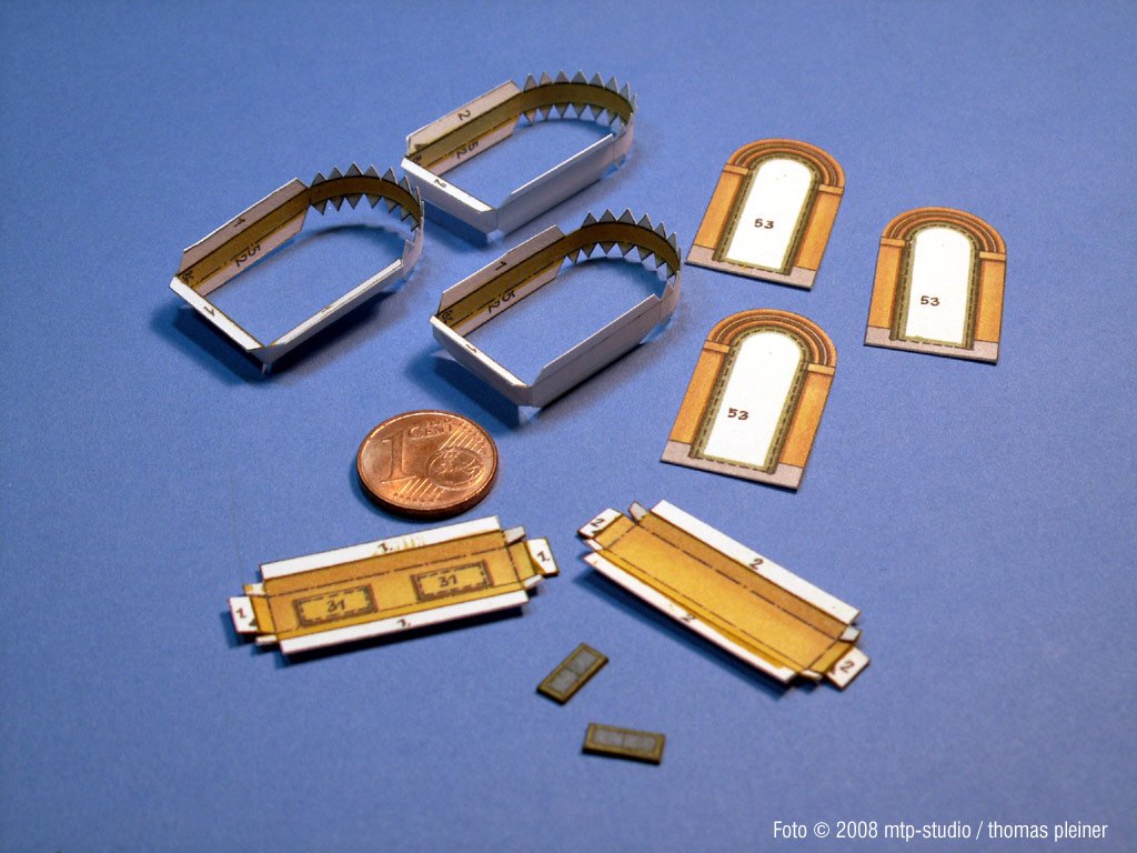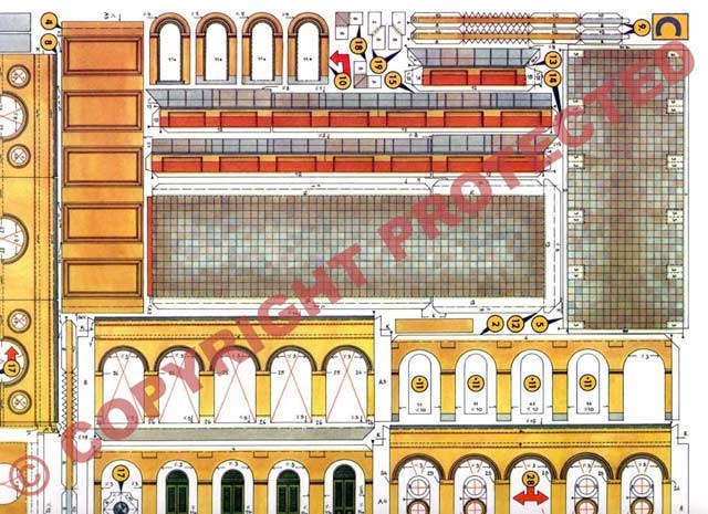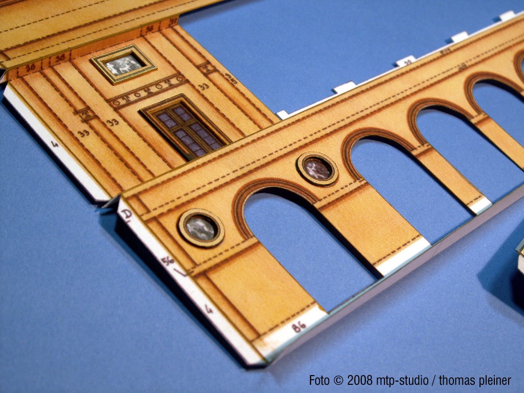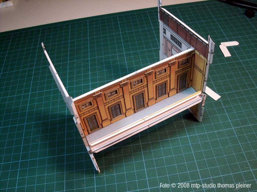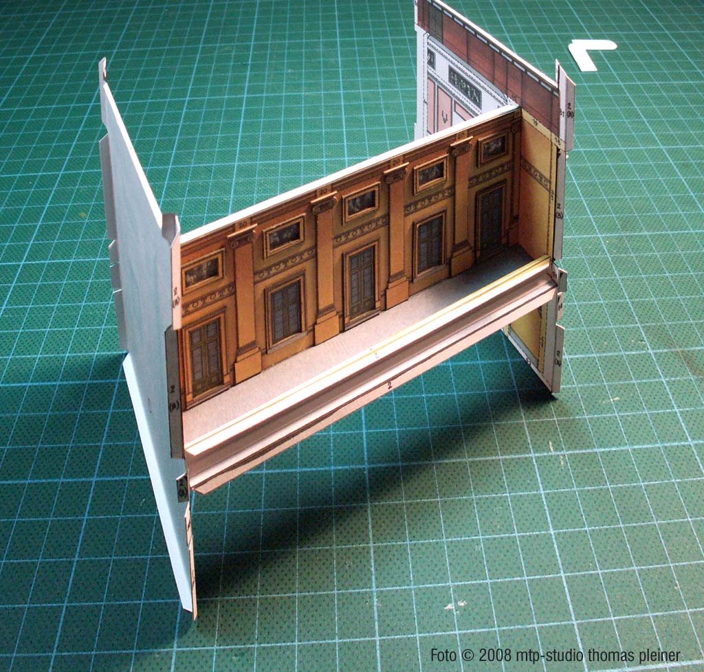 Nach Abheben eines Teil des Hauptdaches kann man in das Innere des grossen Saales blicken. Ob die im Modell dargestellten Reliefs tatsächlich plastisch ausgearbeitet werden können, sei dahingestellt – und wohl nur erfahrenen Kartonmodellbauern angeraten … 🙂