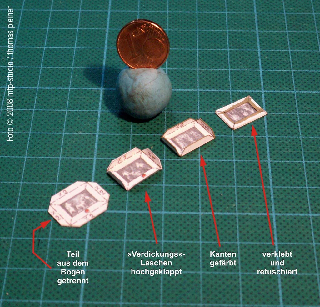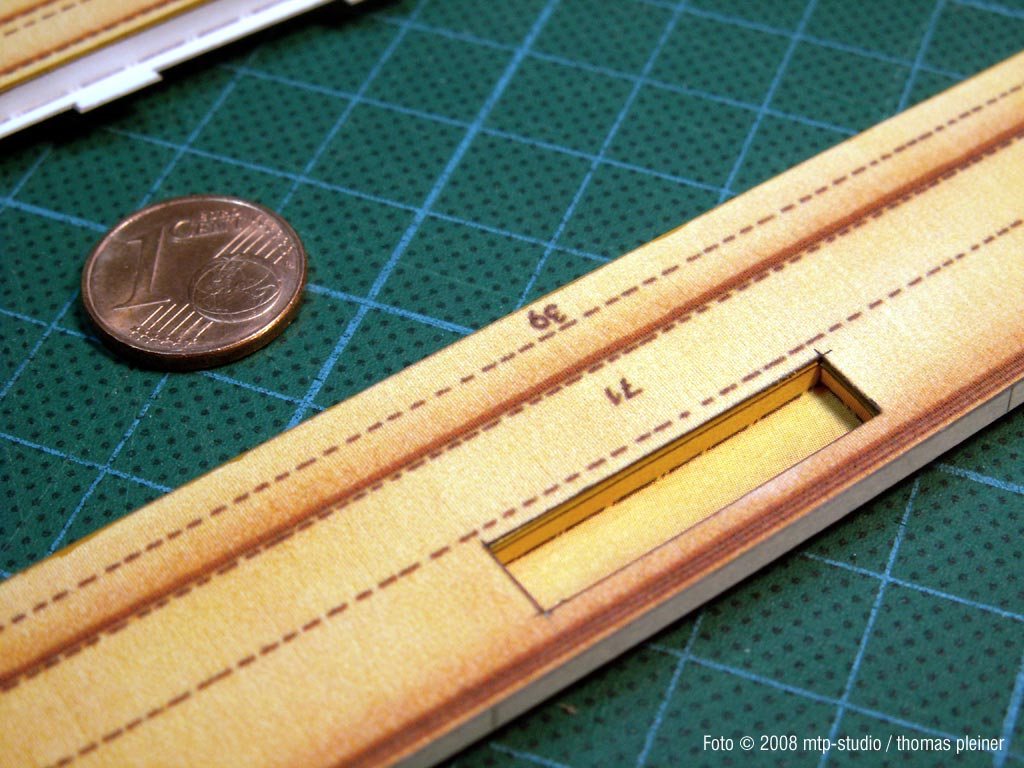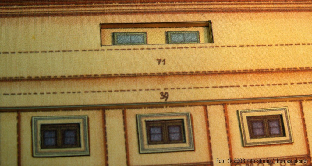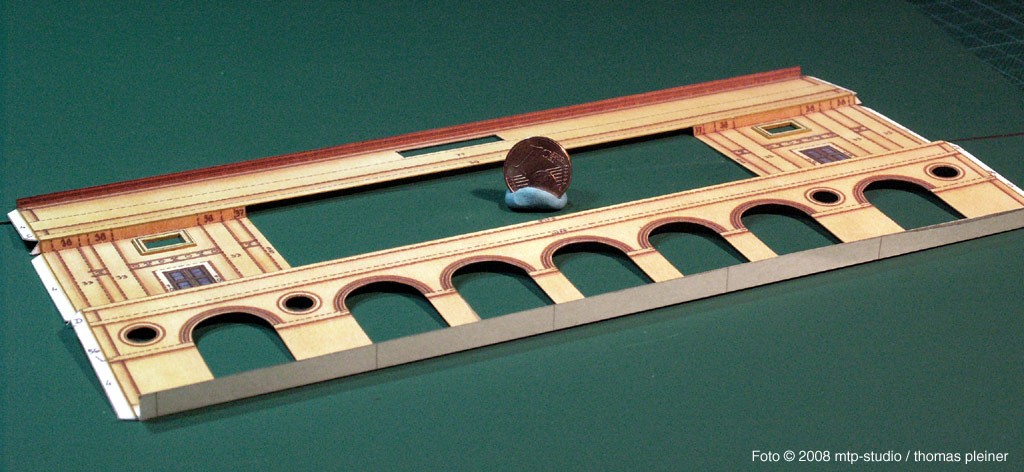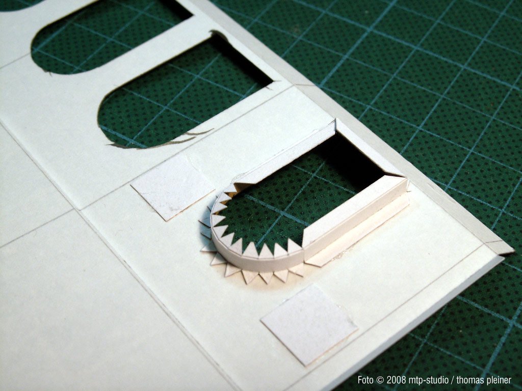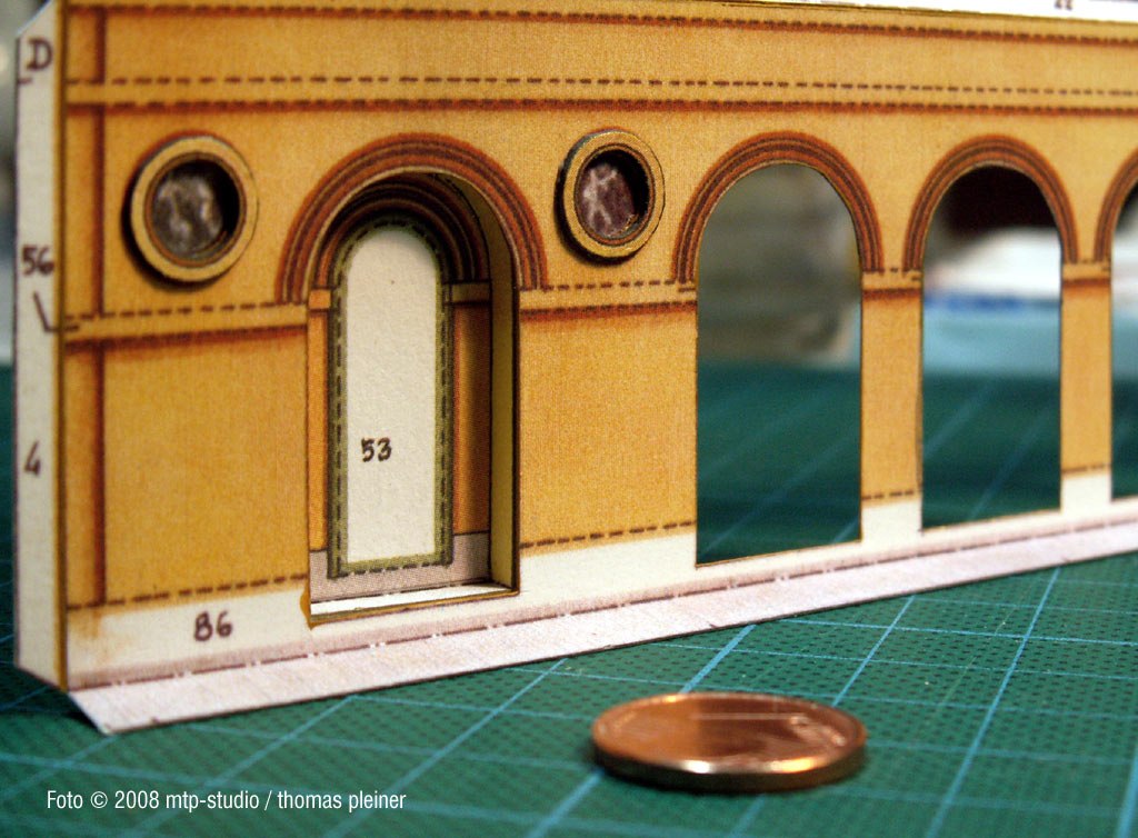 Nach Abheben eines Teil des Hauptdaches kann man in das Innere des grossen Saales blicken. Ob die im Modell dargestellten Reliefs tatsächlich plastisch ausgearbeitet werden können, sei dahingestellt – und wohl nur erfahrenen Kartonmodellbauern angeraten … 🙂