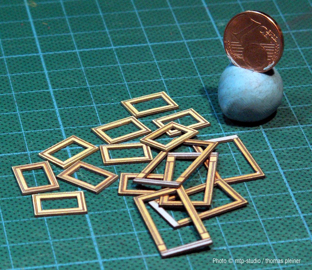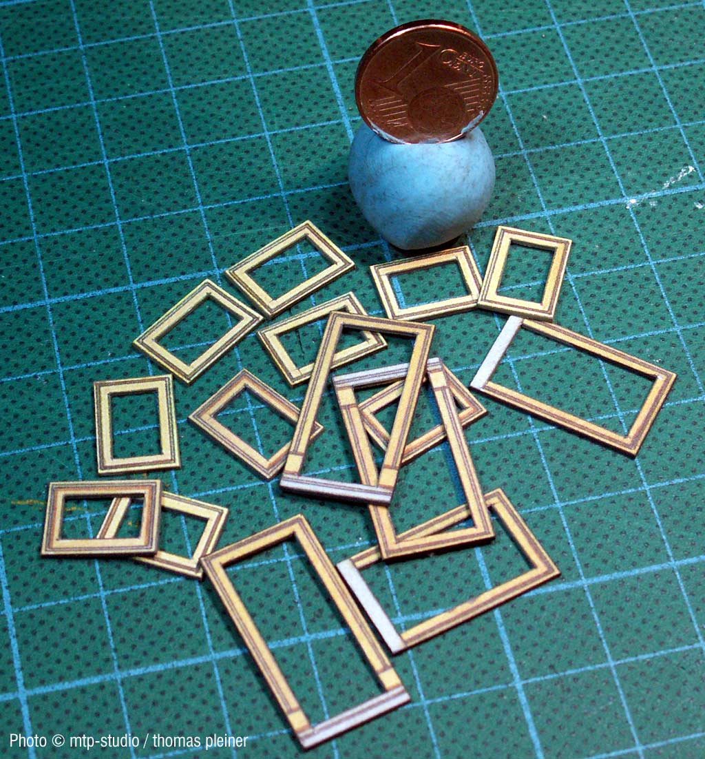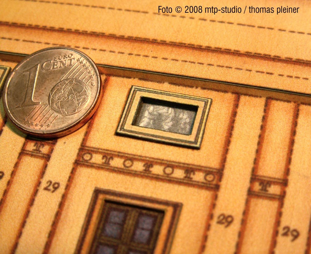 Sauber detailliertes Modell mit ausgebildeten Tür- und Fensterzargen und plastischen Säulen und Pfeilern und Inneneinrichtung.
