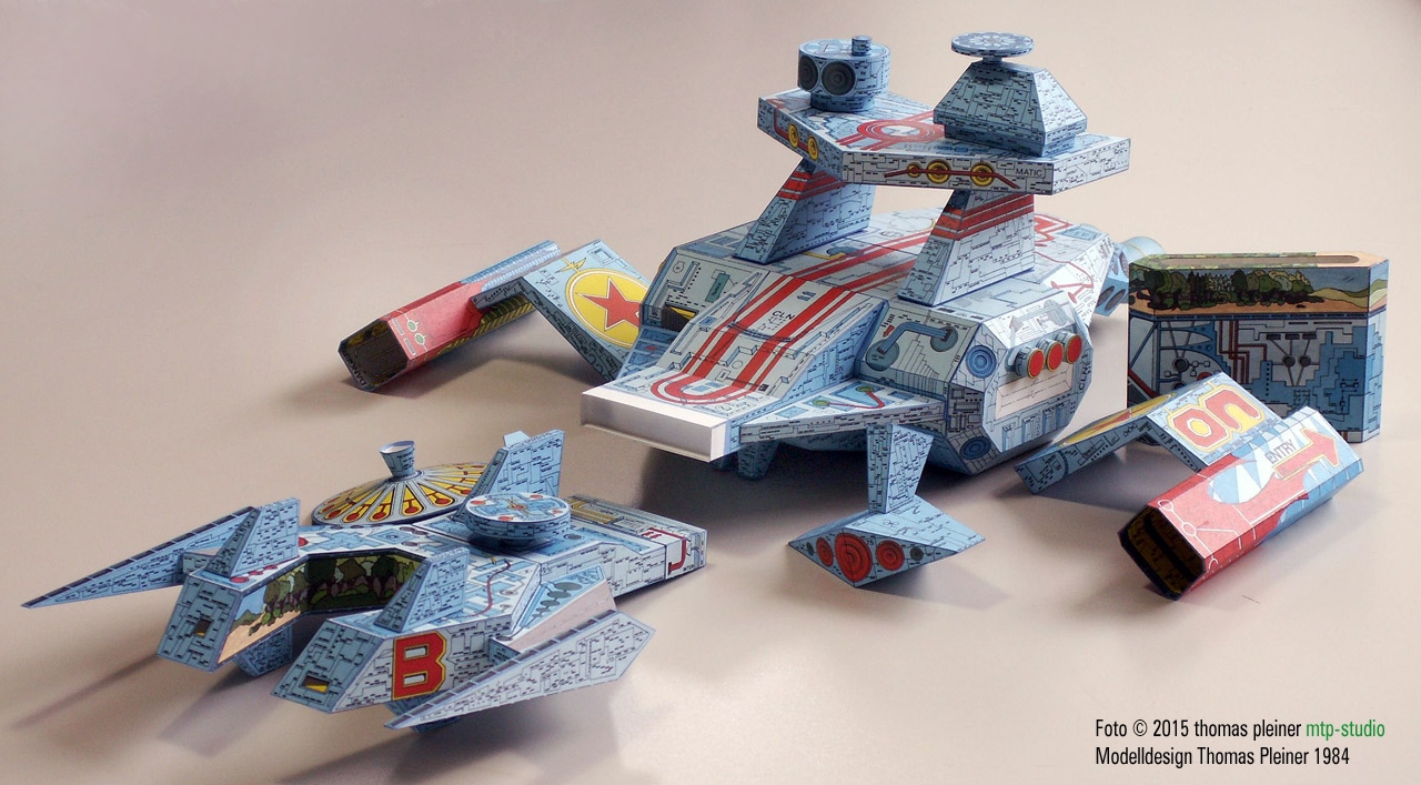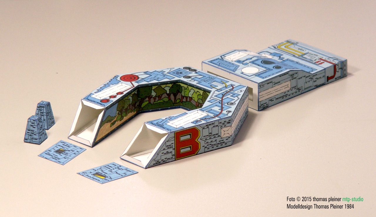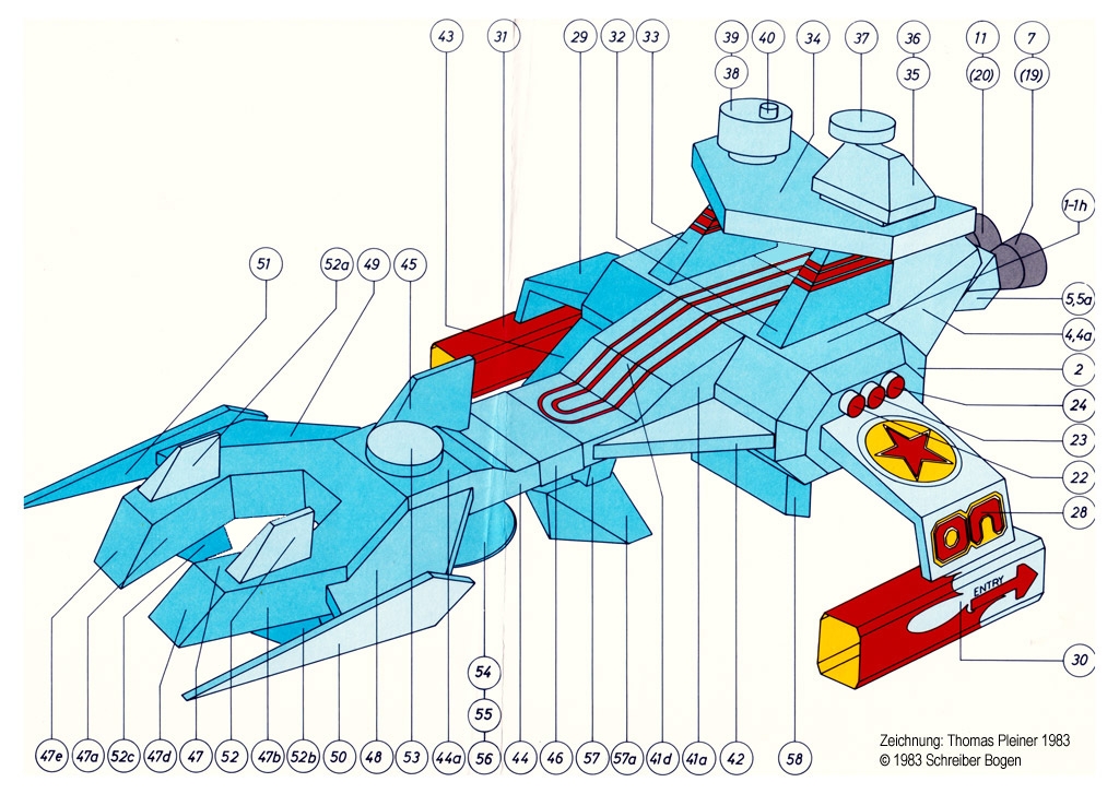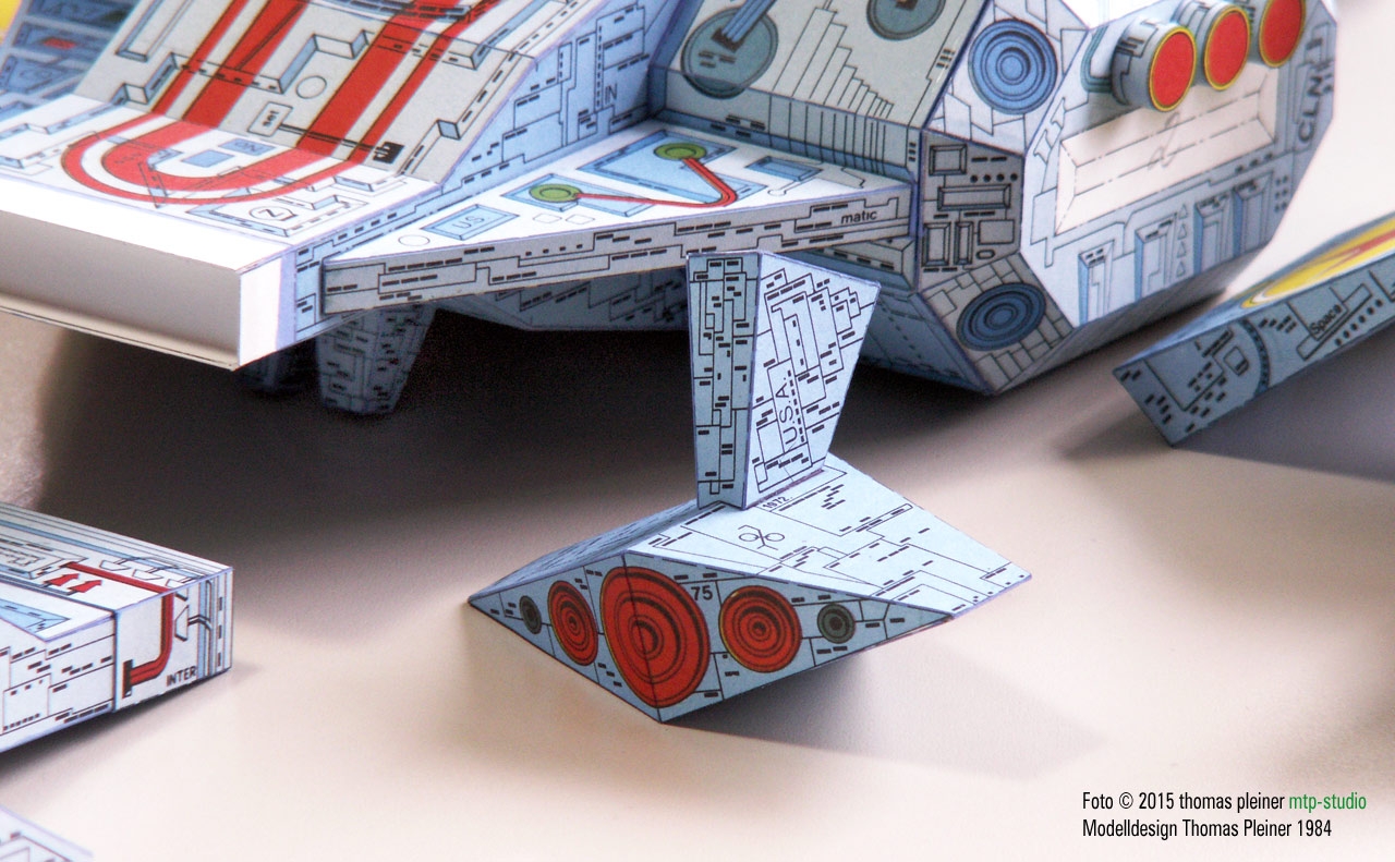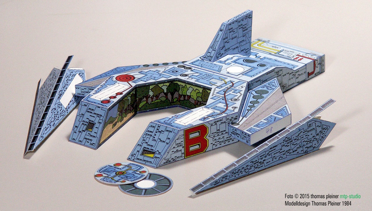 Eine heute (2019) weit über 30 Jahre alte, 1984 bei JFS erschienene, fiktive »Raumschiff«-Konzeption. Alles – wirklich alles – reine Handarbeit…. was wusste man 1984 schon von digital erzeugten Bitmap-Texturen? Und für die Airbrush waren die Strukturen viel zu klein. Daher wurde mit PANTONE Farbfolien und Tempera Guache gearbeitet …