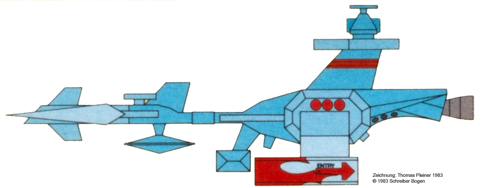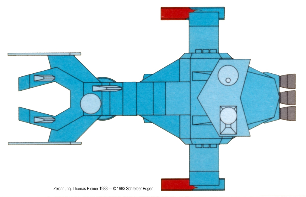 Die grösste Anforderung war, das Ding eben NICHT wie ein »spin off« von »ALIEN«, »Star Wars« oder »Star Trek« aussehen zu lassen, schon gar nicht wie eine Adaption von »2001-Space Odyssey« … in meinem Archiv finden sich dazu sieben weitere Entwürfe, die teilweise exotischer als der dann produzierte waren. Der Verlag hat sich dann für DIESE Variante zur fertigen Ausarbeitung entschieden.
