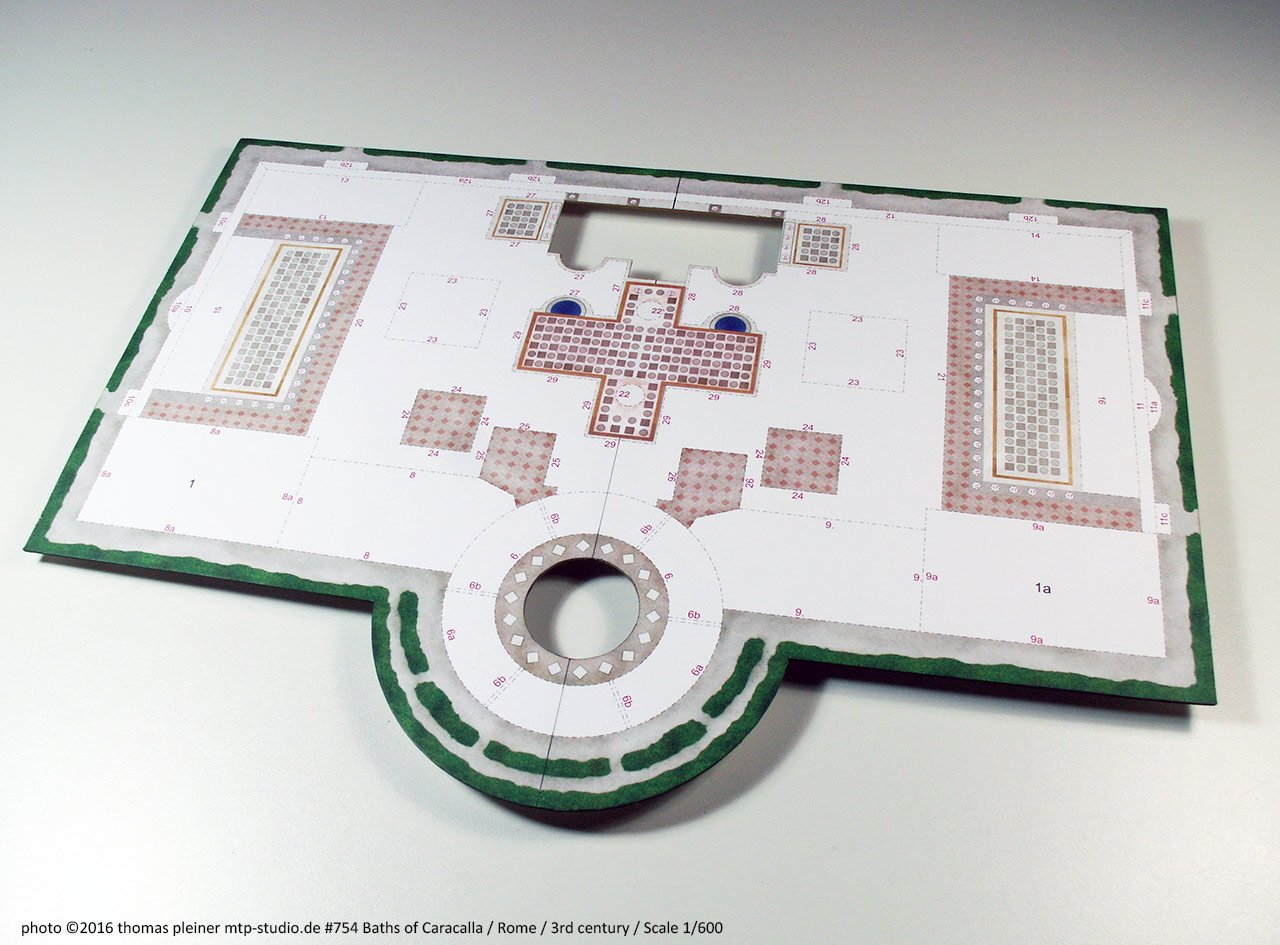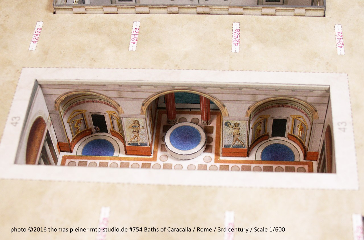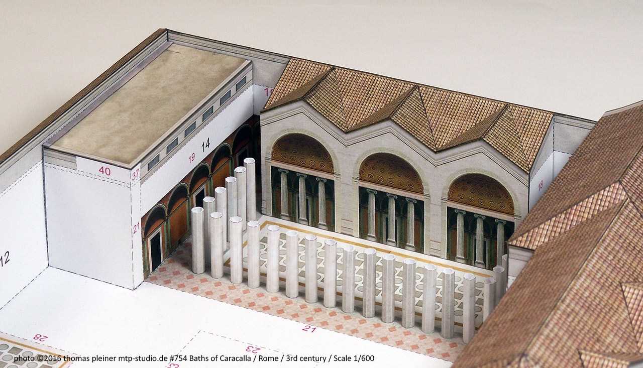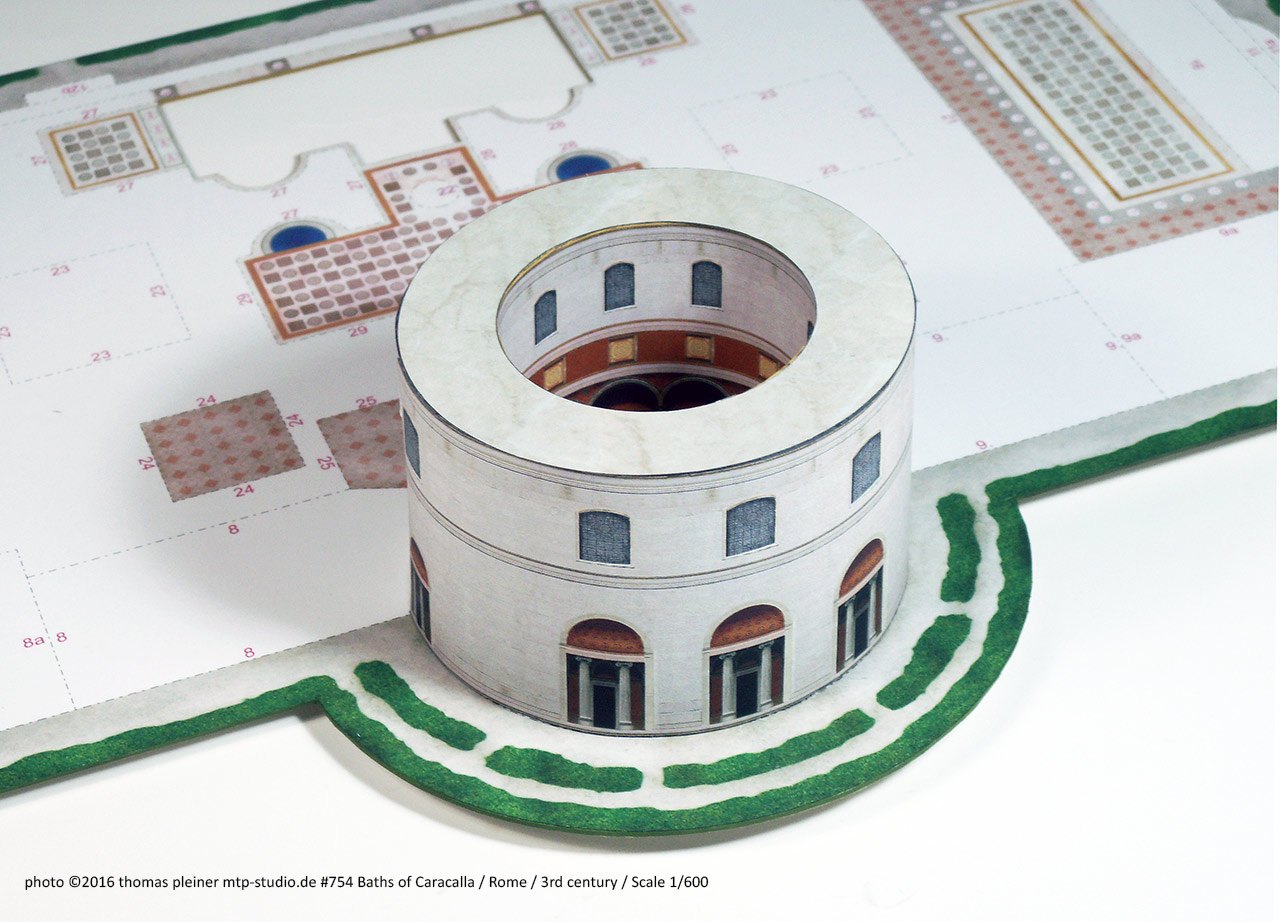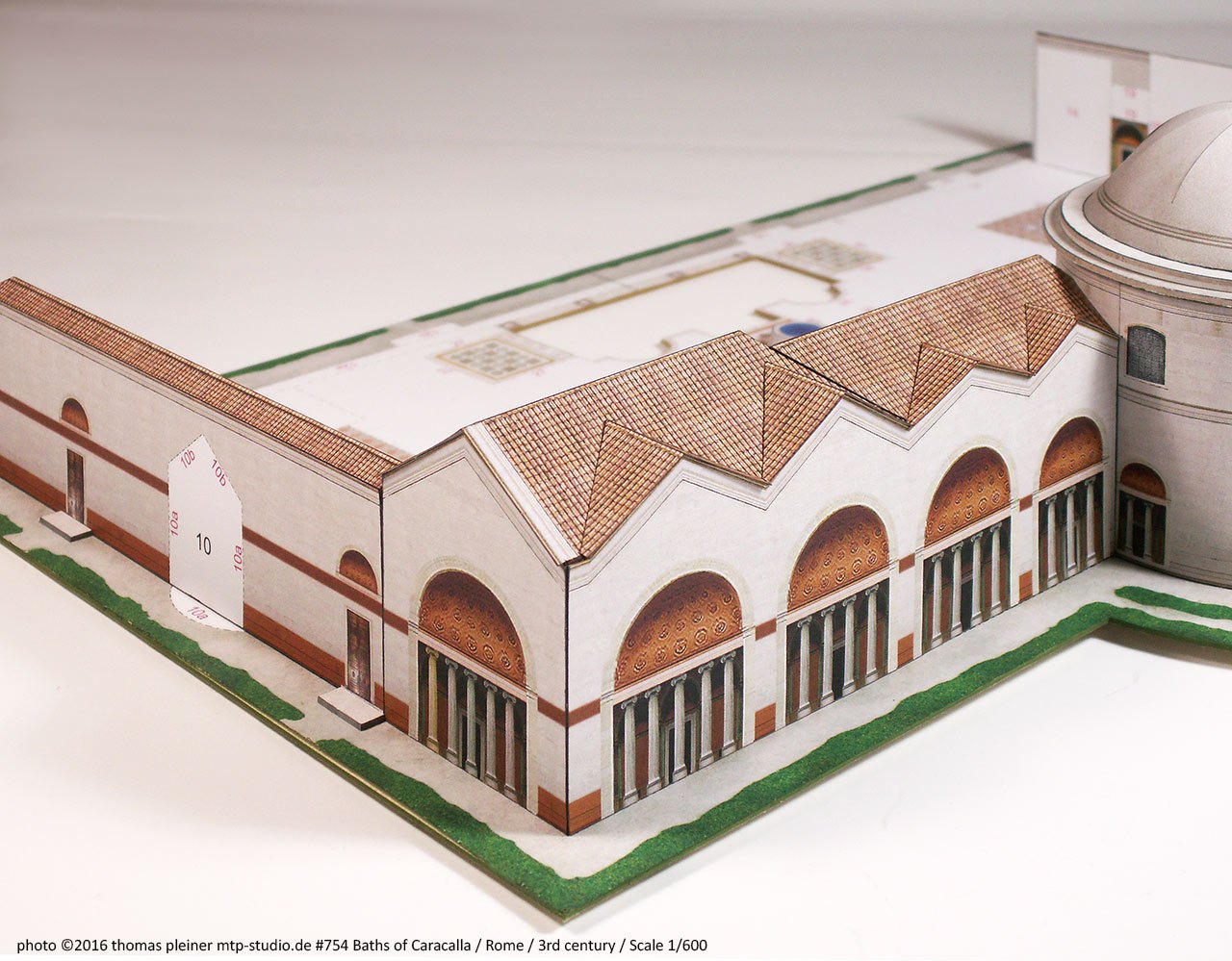 An und für sich stehe ich den Tabernacki-Modellbogen zu römischen Bauten etwas skeptisch gegenüber, besonders was deren Authenzität im Detail betrifft – aber das Modell der Caracalla-Thermen empfand ich als Gesamtwerk schon sehr attraktiv. Das was da gestalterisch erreicht wurde sagt mir: »Ja, so ungefähr hätte es wirklich aussehen können… « Da stören dann so Dinge wie eine befremdliche Ziegeleindeckung einer Außenapsis (siehe Bild 0026) überhaupt nicht … da schmunzelt man allenfalls …