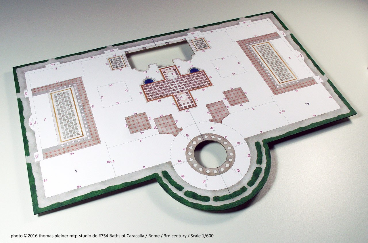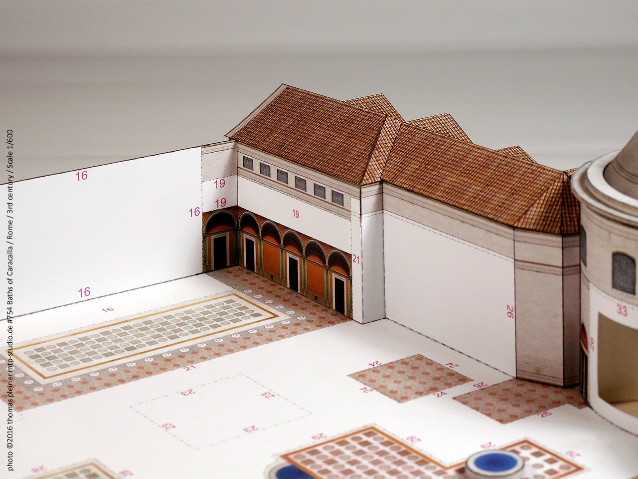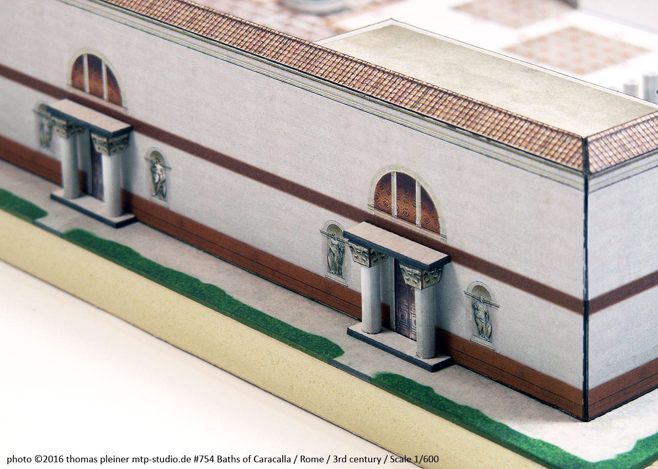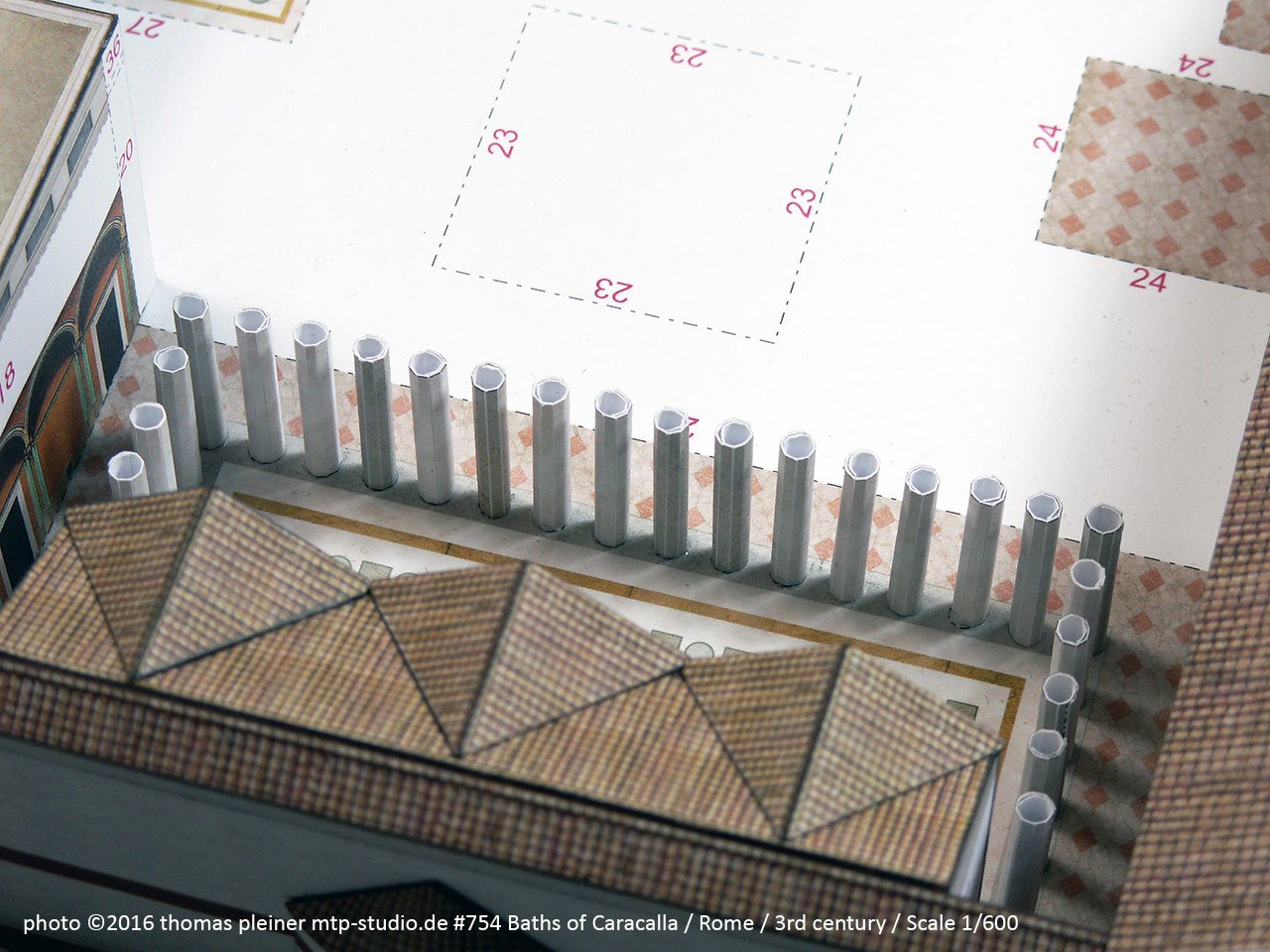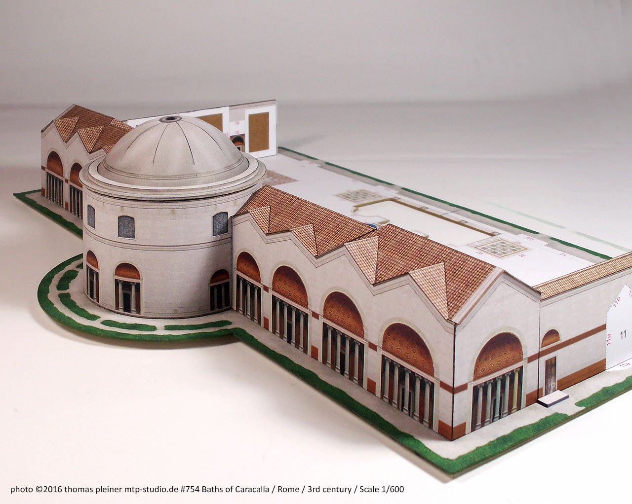 An und für sich stehe ich den Tabernacki-Modellbogen zu römischen Bauten etwas skeptisch gegenüber, besonders was deren Authenzität im Detail betrifft – aber das Modell der Caracalla-Thermen empfand ich als Gesamtwerk schon sehr attraktiv. Das was da gestalterisch erreicht wurde sagt mir: »Ja, so ungefähr hätte es wirklich aussehen können… « Da stören dann so Dinge wie eine befremdliche Ziegeleindeckung einer Außenapsis (siehe Bild 0026) überhaupt nicht … da schmunzelt man allenfalls …