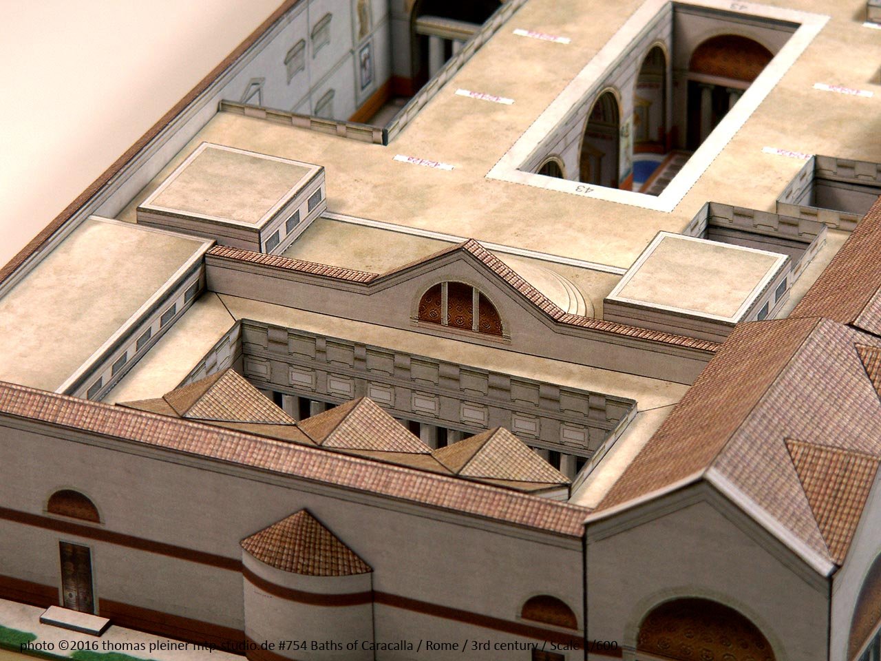 Die Caracalla-Thermen (lateinisch Thermae Antoninianae) sind antike Badeanlagen in Rom. Sie zählen neben den Diokletiansthermen und den Trajansthermen zu den größten Thermenanlagen der Stadt Rom. Das Modell zeigt die riesigen Badeanlagen in Rom in ihrer wundervollen Ausgestaltung mit Fresken und Mosaiken. Auch in dem kleinen Maßstab wird es noch fast 40 cm lang.