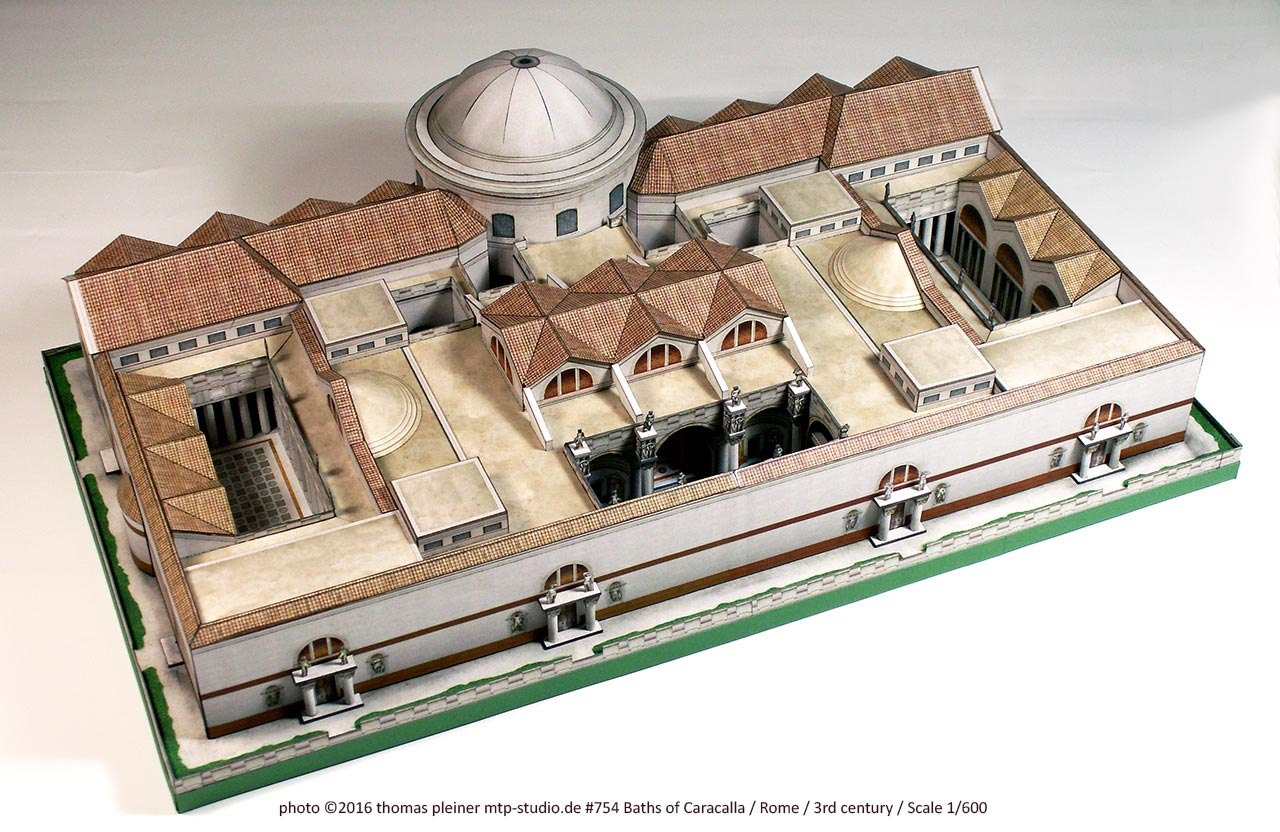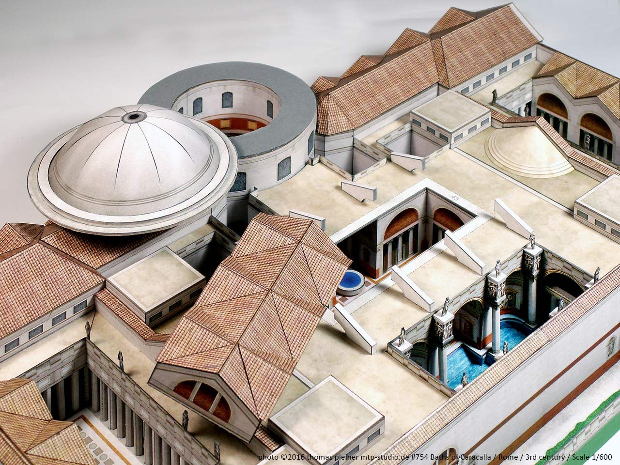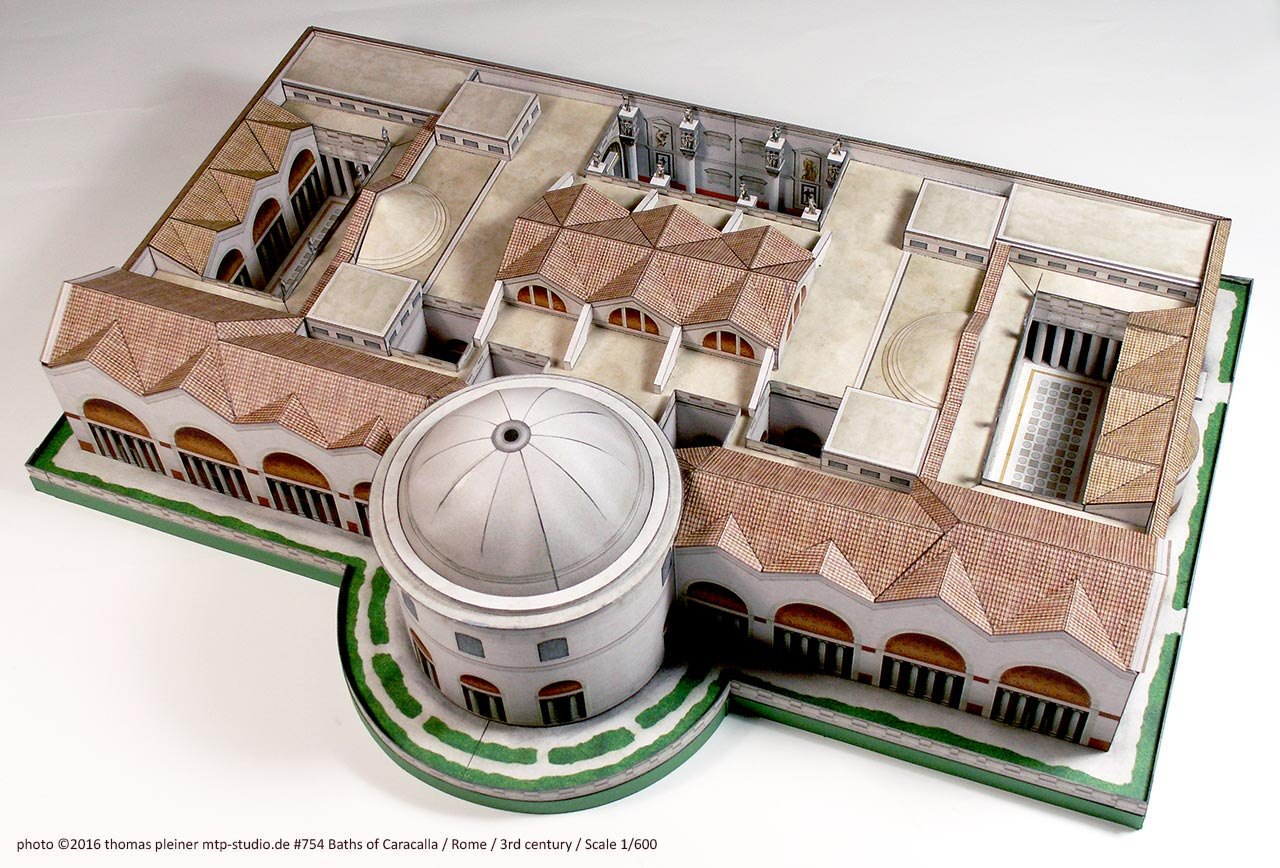 Die Caracalla-Thermen (lateinisch Thermae Antoninianae) sind antike Badeanlagen in Rom. Sie zählen neben den Diokletiansthermen und den Trajansthermen zu den größten Thermenanlagen der Stadt Rom. Das Modell zeigt die riesigen Badeanlagen in Rom in ihrer wundervollen Ausgestaltung mit Fresken und Mosaiken. Auch in dem kleinen Maßstab wird es noch fast 40 cm lang.