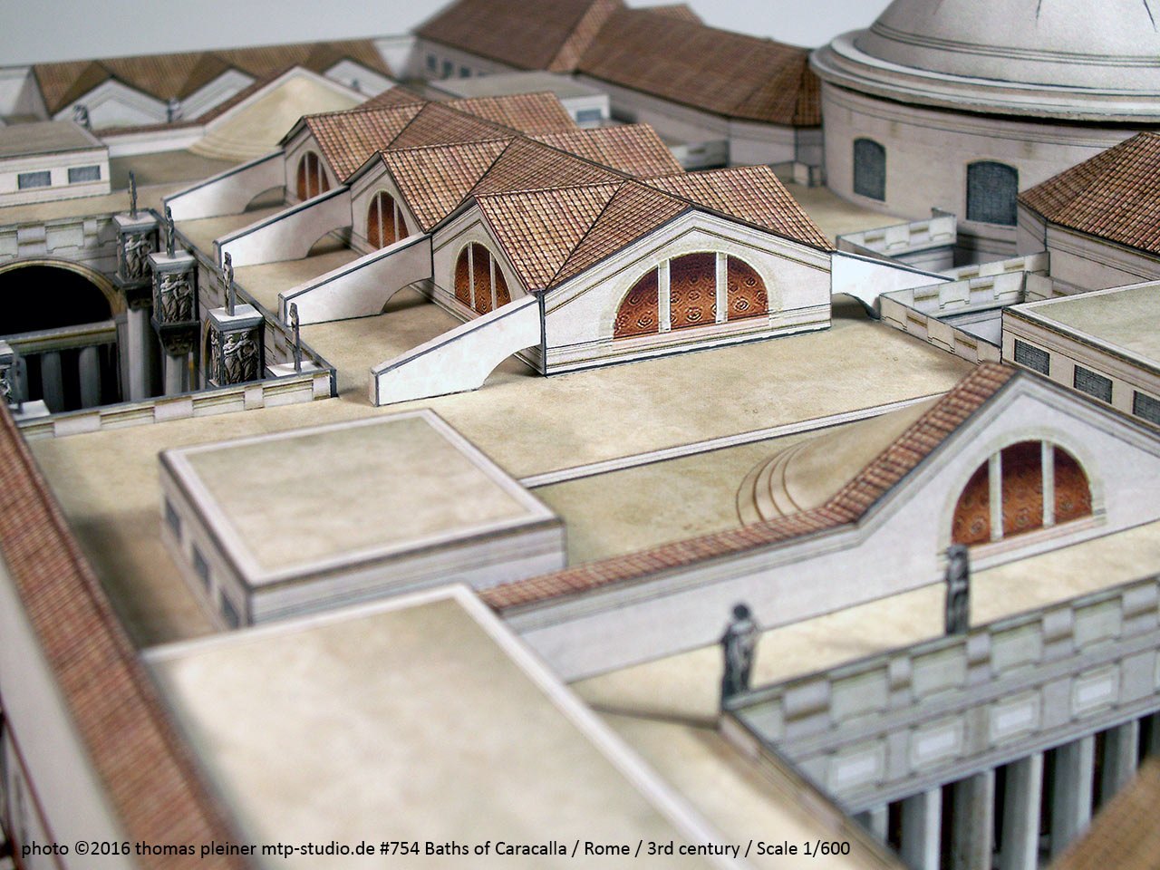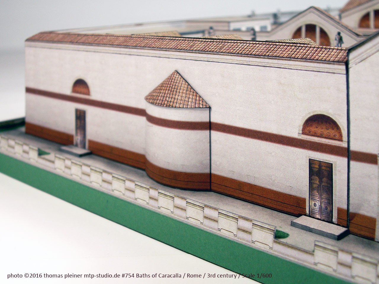 An und für sich stehe ich den Tabernacki-Modellbogen zu römischen Bauten etwas skeptisch gegenüber, besonders was deren Authenzität im Detail betrifft – aber das Modell der Caracalla-Thermen empfand ich als Gesamtwerk schon sehr attraktiv. Das was da gestalterisch erreicht wurde sagt mir: »Ja, so ungefähr hätte es wirklich aussehen können… « Da stören dann so Dinge wie eine befremdliche Ziegeleindeckung einer Außenapsis (siehe Bild 0026) überhaupt nicht … da schmunzelt man allenfalls …