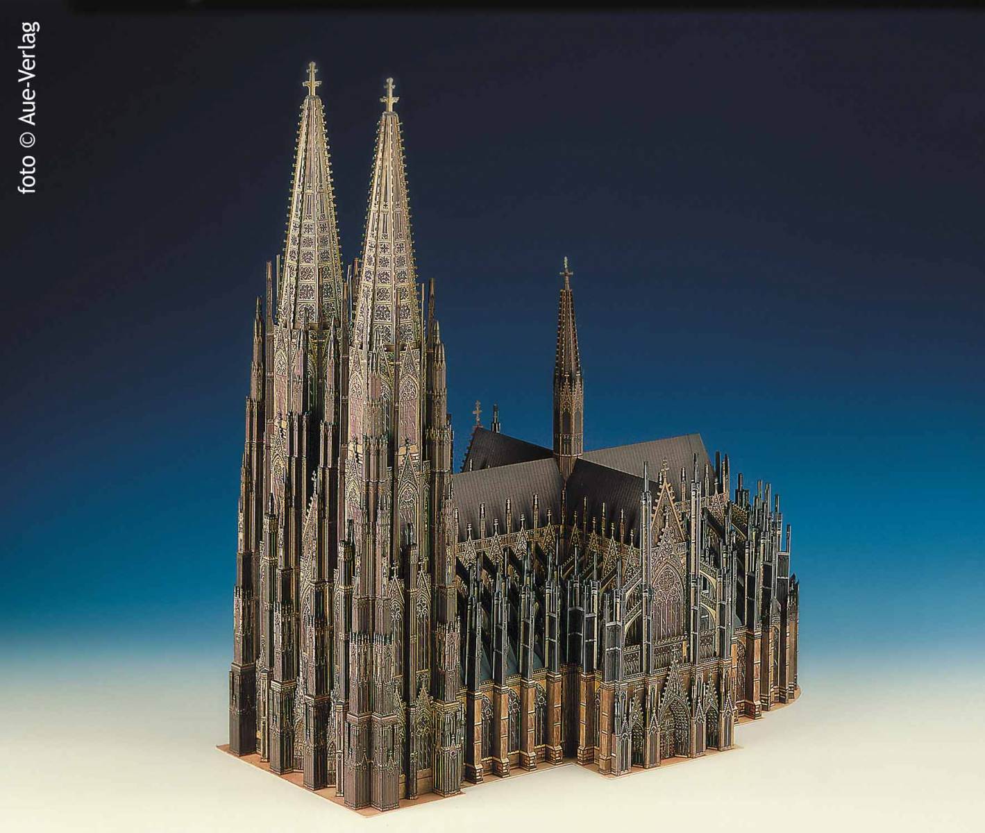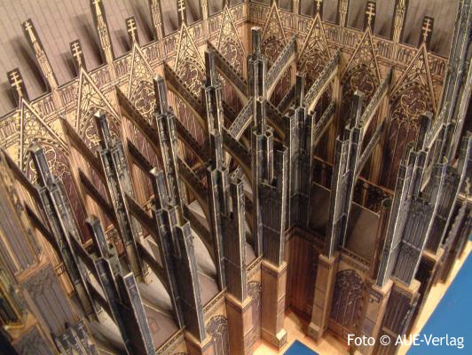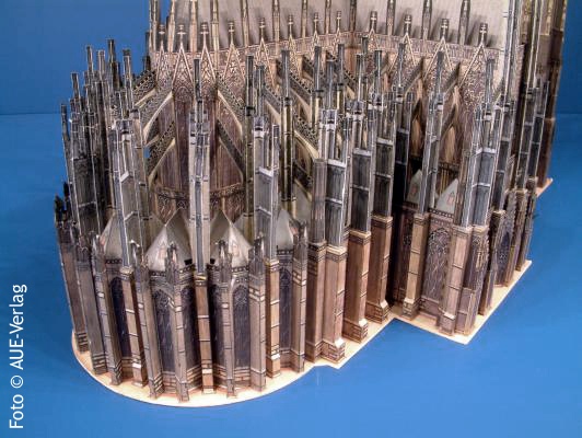 Die selbstgestellten hohen Anforderungen wurden durch das Nachvollziehen der originalen Bauabfolge noch unterstrichen: Tatsächlich beginnt der Zusammenbau des Modells mit dem Chor und schreitet über die Unter- und Obergeschosse des Lang- und Querhauses bis hin zu den Westtürmen und dem Vierungsreiter fort. Die den gotischen Stil wesentlich mitprägenden »inneren« Strukturen des Doms sollten und konnten natürlich im Modell nicht gezeigt werden – die Gründe hierfür liegen auf der Hand. Durch die grundsätzlich verstandene Art und Weise des Dom Aufbaus gestaltete sich die Konstruktion der Abwicklungen relativ unkompliziert; das Modell wächst sozusagen aus einem inneren, »glatten« Kern nach außen, wobei die »zerklüfteten« Strukturen durch daran- und davorgestellte Kulissen nachgebildet werden.