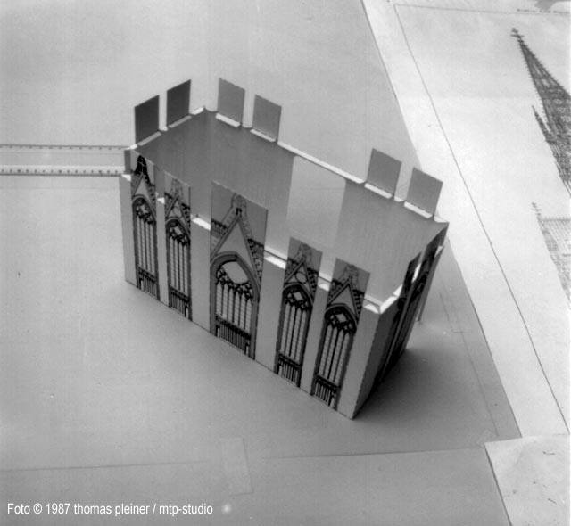 Als Liebhaber sakraler, speziell gotischer Architektur, war die Modellentwicklung in zweierlei Hinsicht eine Herausforderung an meine zeichnerischen Fähigkeiten: erstens sollte ein Modell entstehen, das hohen Ansprüchen genügte, originalgetreu bis ins kleinste Detail gezeichnet und zweitens in der Konstruktion auf wenige räumliche Grundelemente beschränkt blieb, um auch weniger Geübten ein gelungenes Modeli zu ermög!ichen. Daß dies allen an der Produktion Beteiligten gelungen ist, beweist die stattliche Zahl von ca 3.000 verkauften Modellen in den ersten zweieinhalb Jahren seit dem Erscheinen.