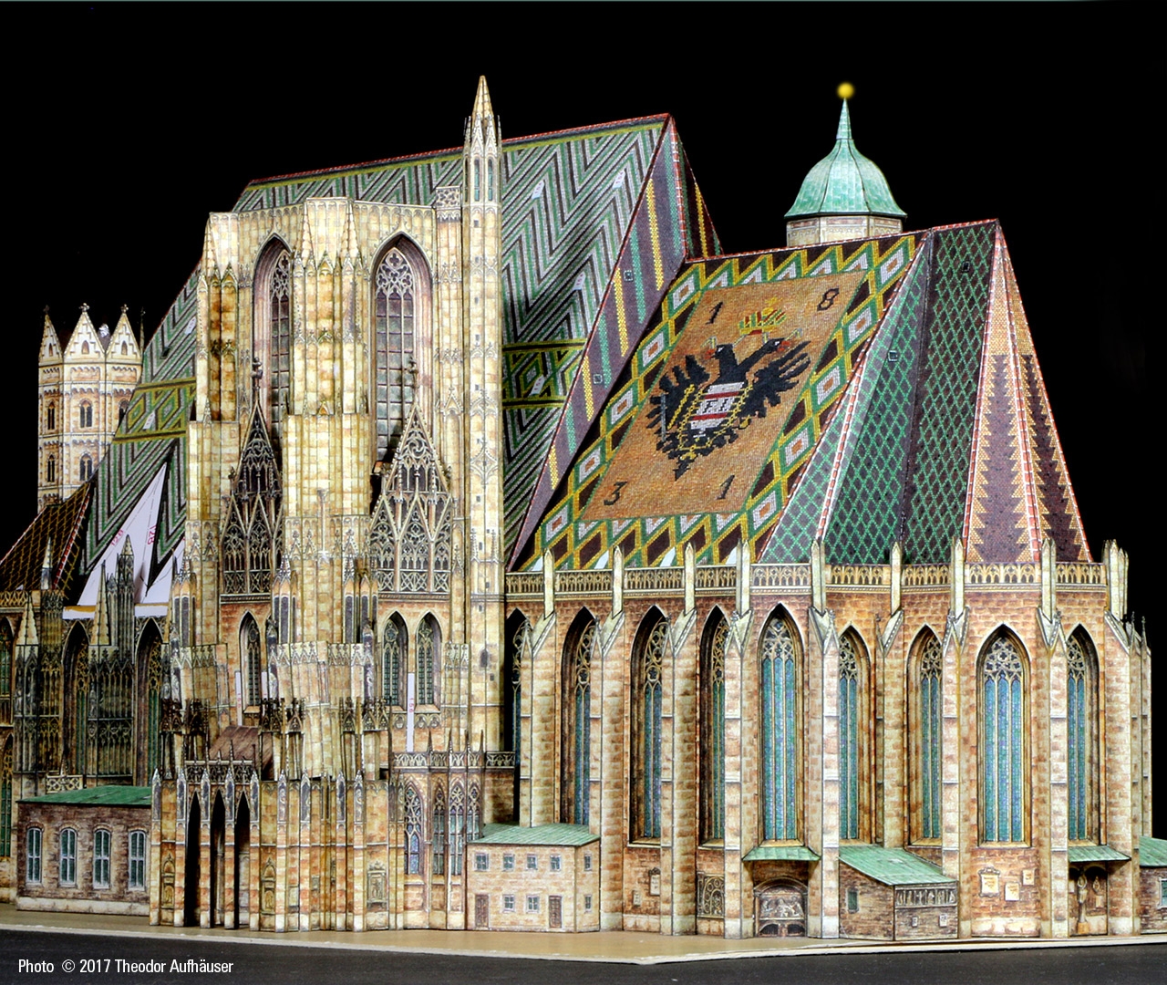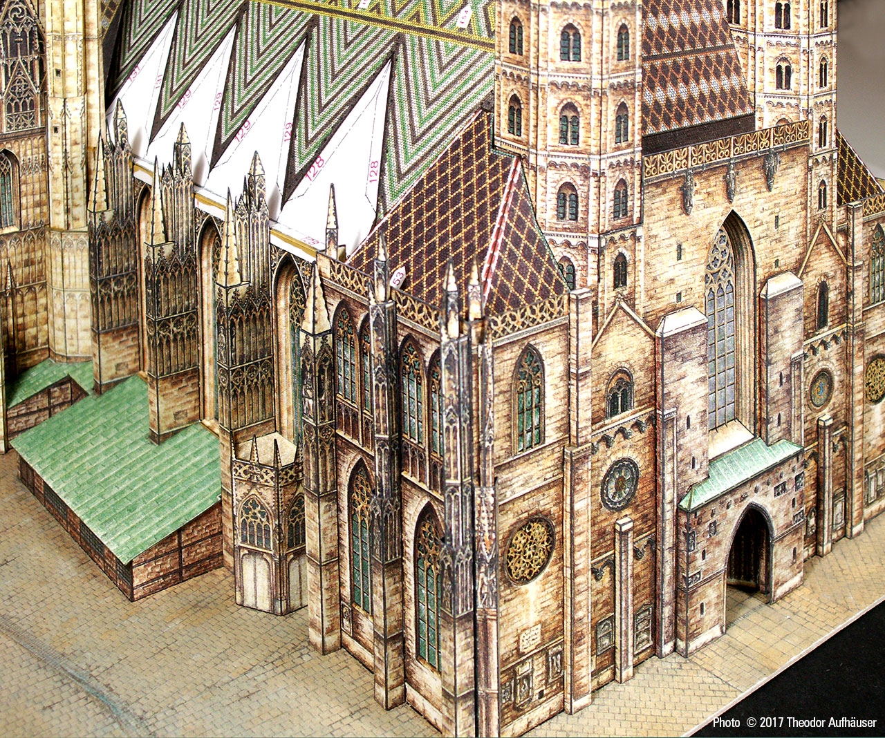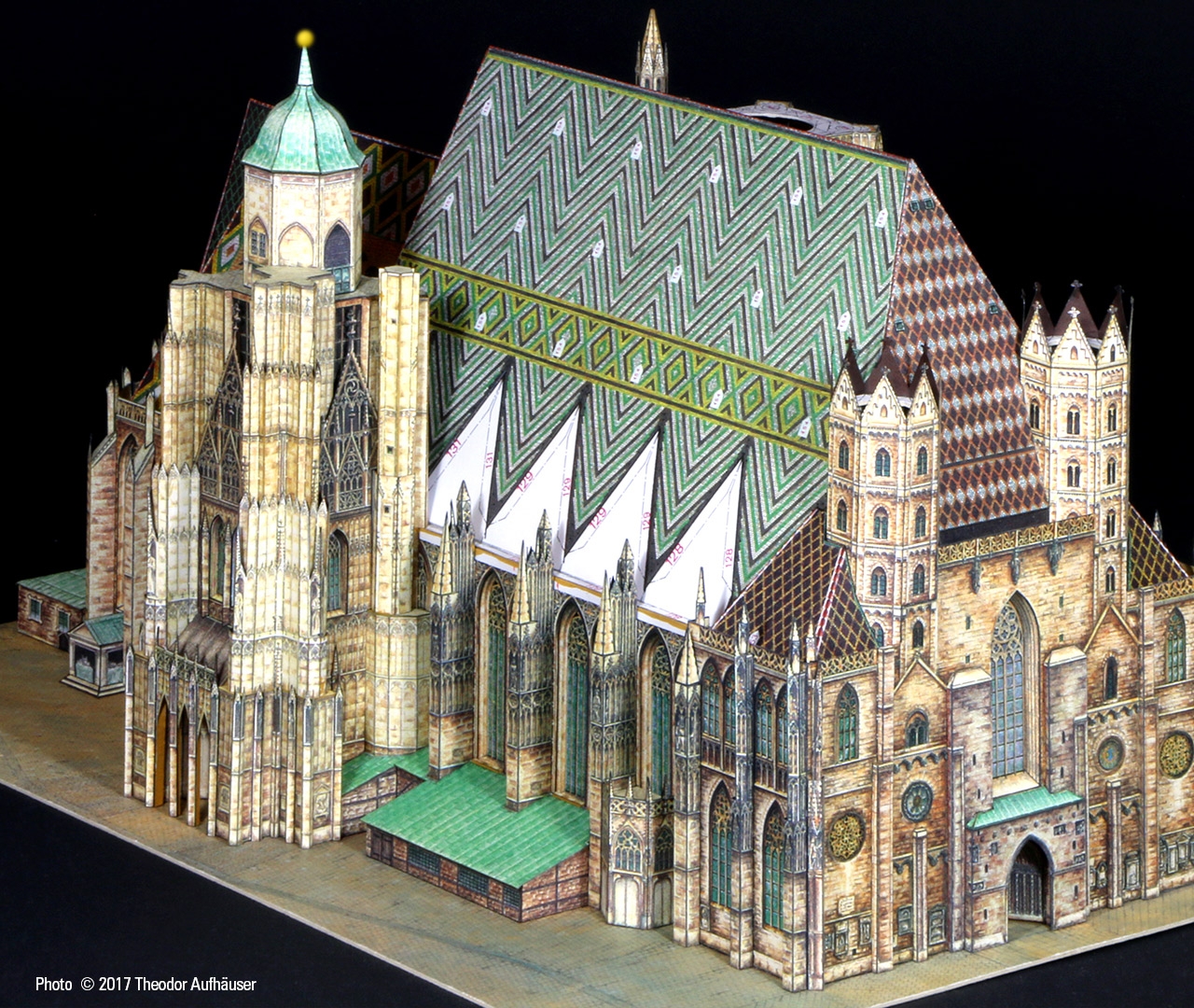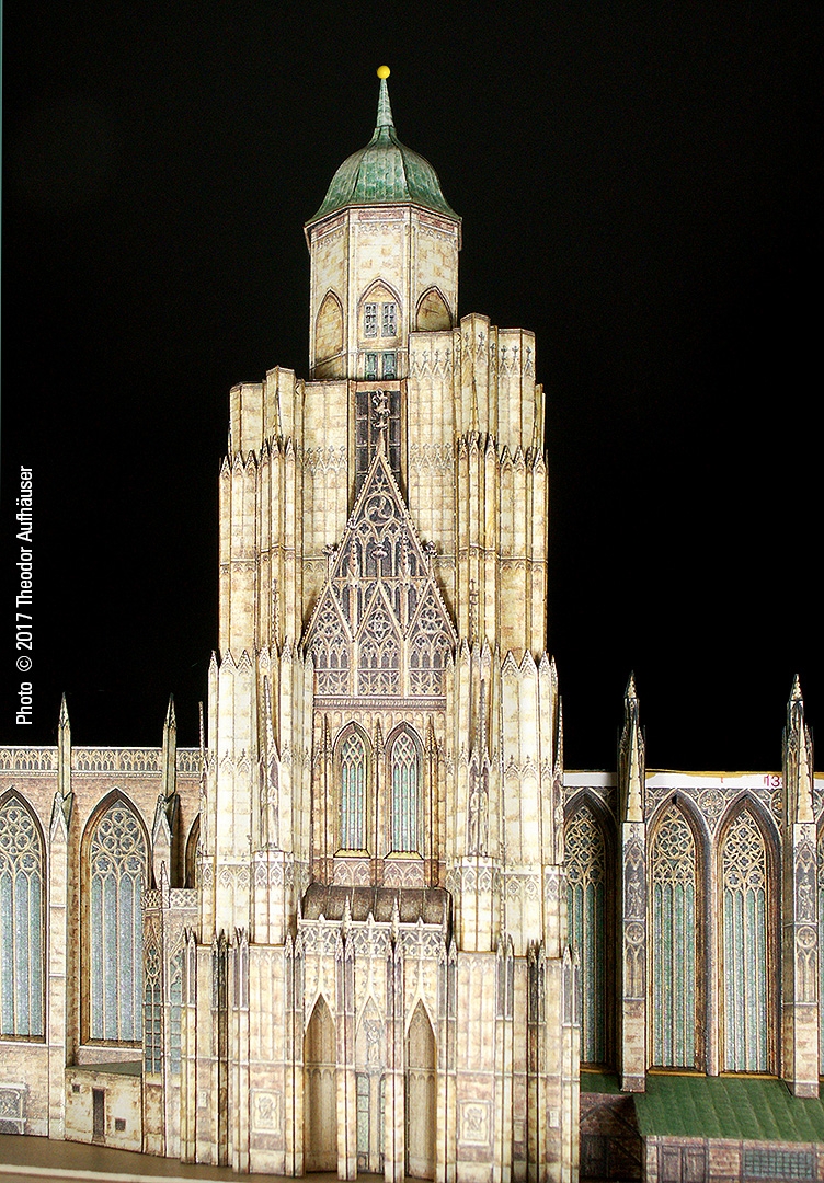 Ein guter Kompromiss die Detaillierung und Baubarkeit betreffend und die Binnenzeichnung wird dem Wiener Wahrzeichen in jeder Hinsicht gerecht. Begrüßenswert: Die Konstruktion ist keine digitale Arbeit und die Binnenzeichnung ist KEINE fotorealistische Umsetzung sondern eine brillante manuelle Grafik … minimale kleinste grafische Schwächen sind bauwerkbedingt (Für Darstellungen kleinster Kreuzblumen in 1:300 finden sich schwerlich zeichnerische Kompromisse).