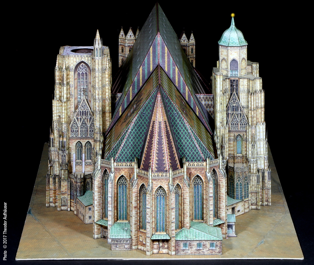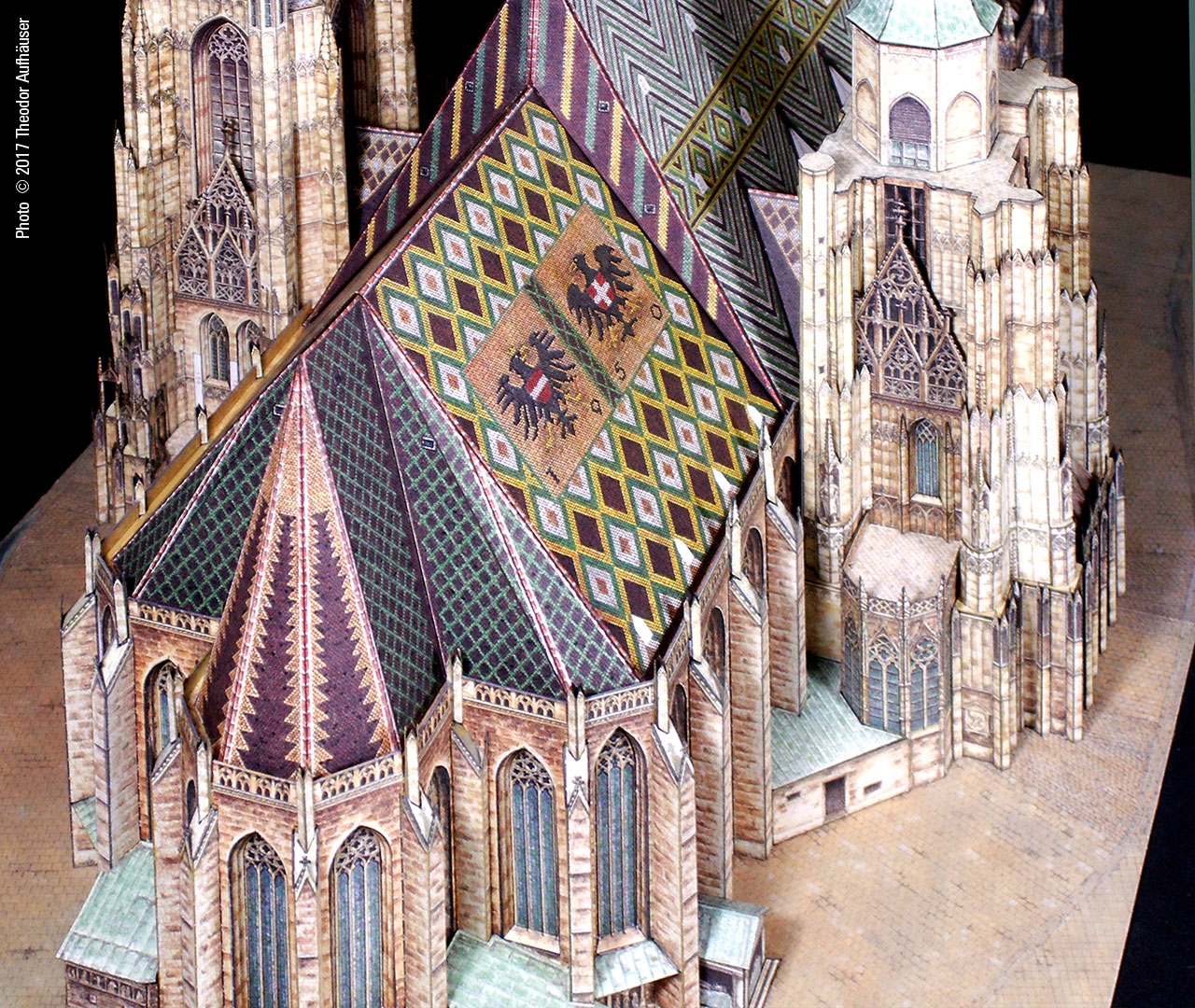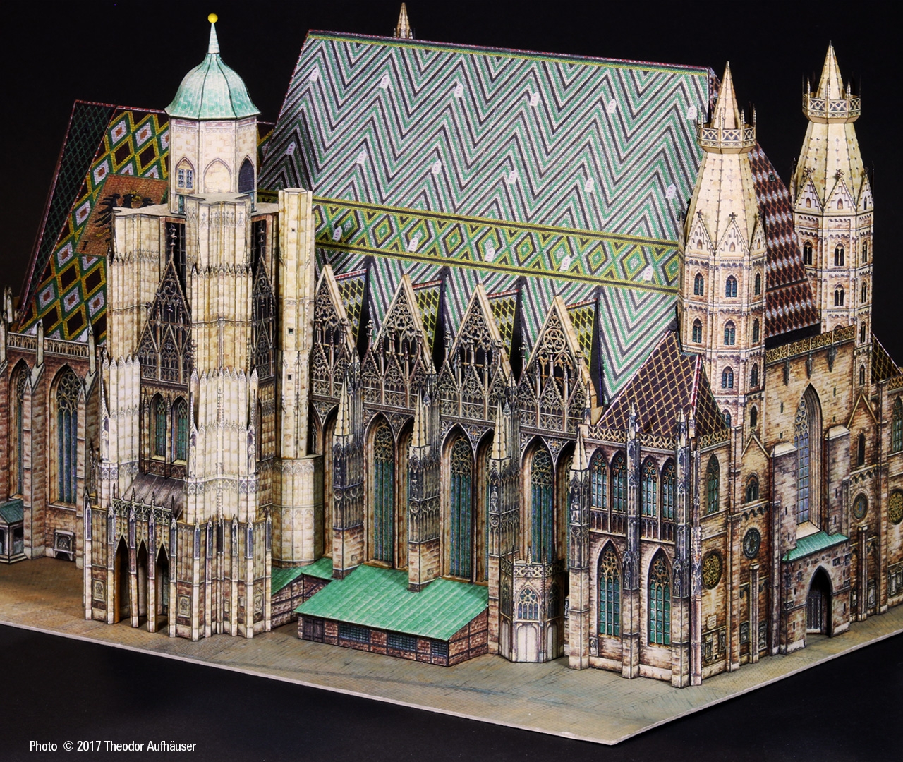 Ein guter Kompromiss die Detaillierung und Baubarkeit betreffend und die Binnenzeichnung wird dem Wiener Wahrzeichen in jeder Hinsicht gerecht. Begrüßenswert: Die Konstruktion ist keine digitale Arbeit und die Binnenzeichnung ist KEINE fotorealistische Umsetzung sondern eine brillante manuelle Grafik … minimale kleinste grafische Schwächen sind bauwerkbedingt (Für Darstellungen kleinster Kreuzblumen in 1:300 finden sich schwerlich zeichnerische Kompromisse).
